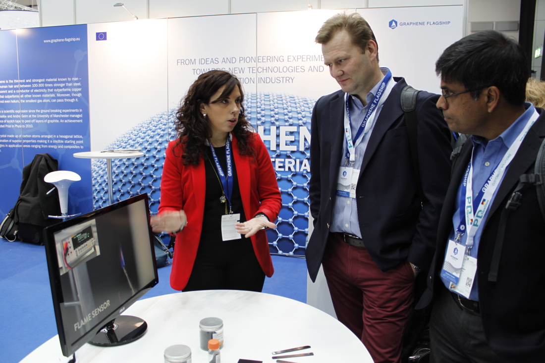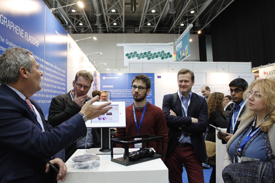 The Graphene Flagship’s exhibition stand showcased products, prototypes and applications along the value chain, from graphene inks and powders, to conductive resins and flexible printed antennas, all the way up to a commercially available helmet with a heat resistant graphene coating, developed through a collaboration between the Flagship partner Italian Institute of Technology (IIT) and design company MomoDesign. “Visitors have been really interested in our helmet, in how graphene was integrated in the paint used as the coating for the helmet, and the possibility to apply this kind of material and technology in paints for cars, for motorbikes and also in the aerospace industry.” said Luca Gagliani from IIT, who was one of the members of the Graphene Flagship on hand to guide visitors to the Flagship’s exhibition stand. Gagliani pointed out that the benefit of graphene lies its multifunctionality, since with graphene it is “possible to get electrical conductivity, thermal conductivity and high reinforcement of the mechanical properties at the same time.”