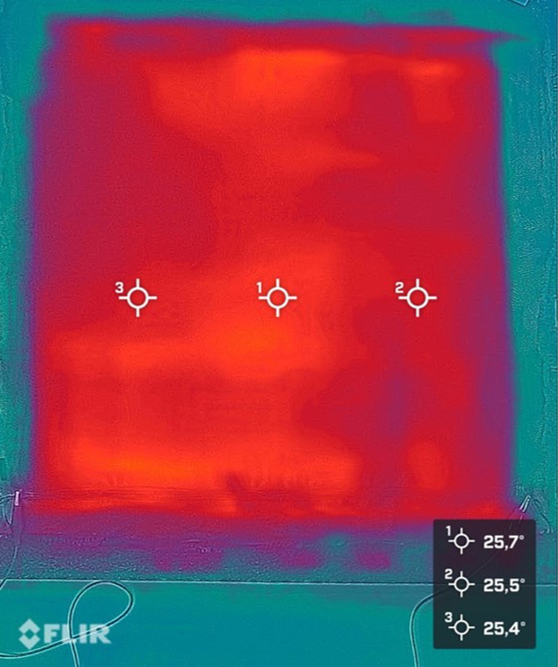 Thermal imaging of heat irradiated graphene-coated glass fibre layer in a hybrid composite. The room temperature was 18°C; the clear and uniform heat is observed already at application of 12 V/0.1 A of electrical power. (credit: Grafren AB)